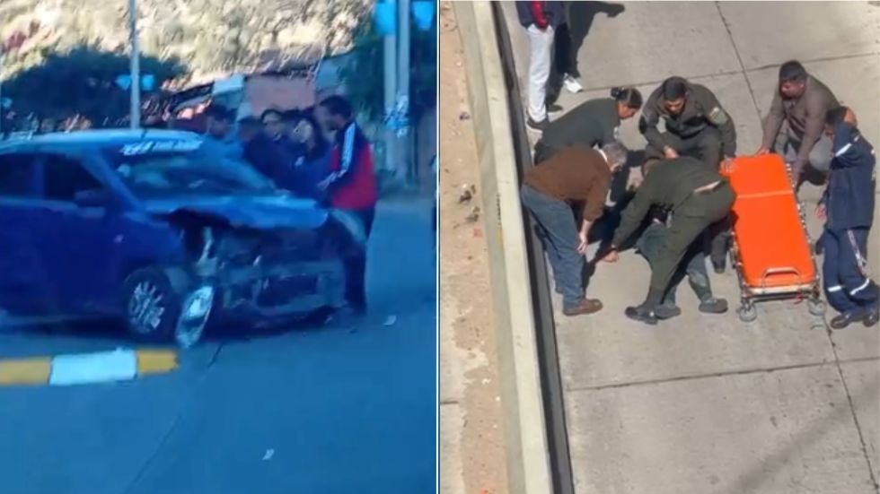 Un vehículo quedó con severos daños tras un choque; al lado, el auxilio a un motociclista. Foto: Composición Correo del Sur Dos accidentes de tránsito se produjeron en cuestión de horas, la mañana de este miércoles, en la avenida Circunvalación de la ciudad de Sucre.