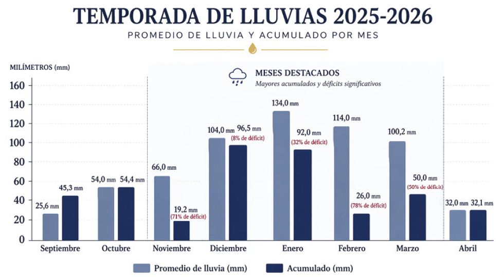 Por ejemplo, la temporada DE septiembre de 2024 a abril de 2025 se registró un total de 846,5 mm de agua acumulada, siendo uno de los últimos períodos con mayores precipitaciones pluviales.