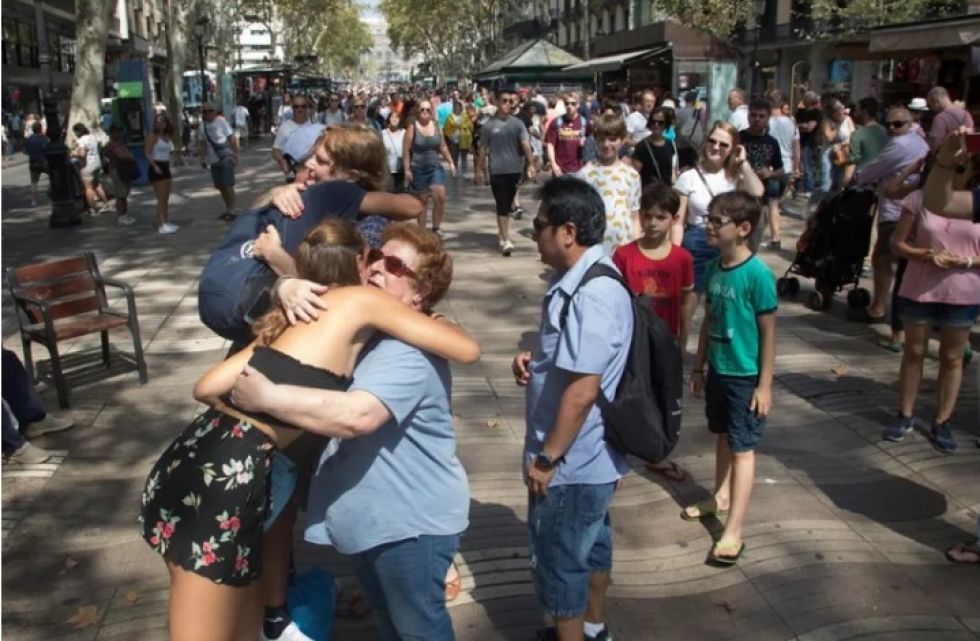 Dos jóvenes daban abrazos "gratis" a todas aquellas personas que paseaban por Las Ramblas de Barcelona.