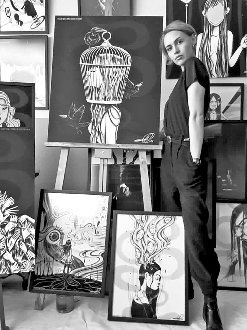 Sus obras, llenas de contrastes y símbolos, transitan entre el blanco y el negro —colores que también pide a los asistentes usar durante la inauguración— porque representan la dualidad de la vida entre la luz y la oscuridad. “En el arte, como en la vida, todo tiene matices. No hay claridad sin sombra”, reflexiona.