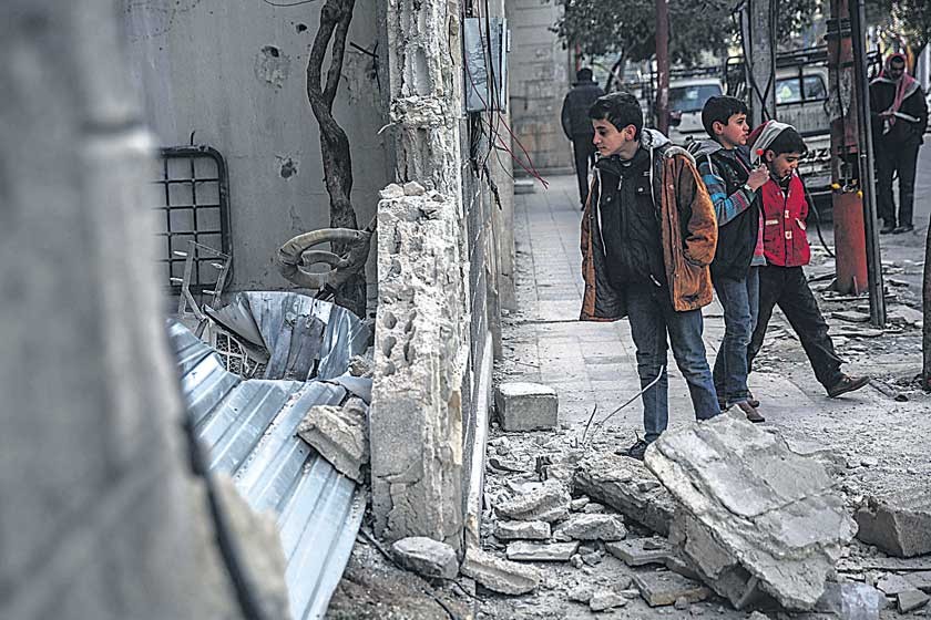 GUERRA. Curiosos inspeccionan los restos de una bomba tras un ataque aéreo de las fuerzas leales a Bachar al Asad... Alrededor de medio millón de personas en Siria están en ciudades sitiadas y podrían estar quedándose sin alimentos o haberlo hecho ya, según advirtió ayer Naciones Unidas.