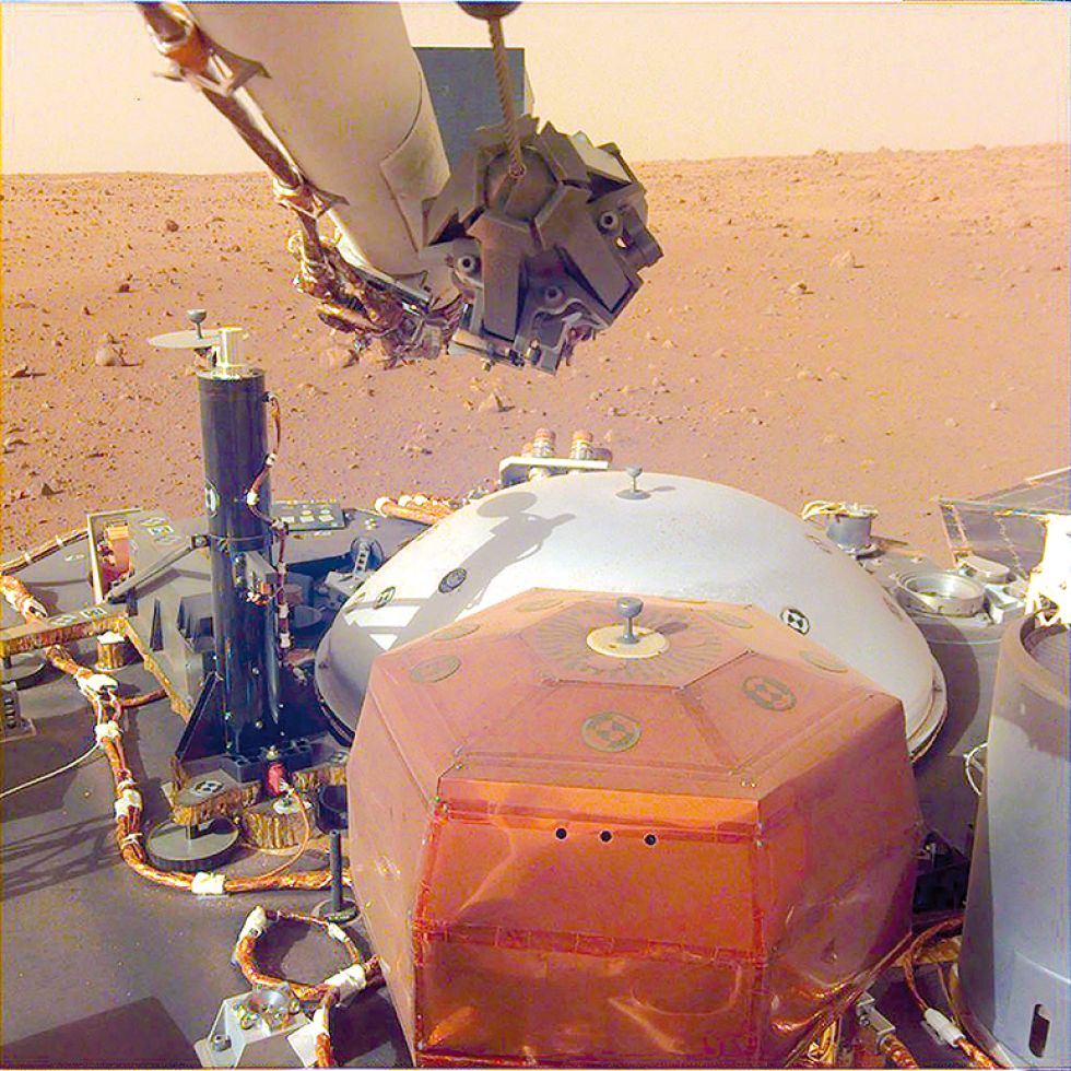 El ‘sismómetro’ del InSight está recubierto de un escudo térmico y contra el viento, y tiene el nombre de Experimento sísmico para estructura interior (SEIS, por sus siglas en inglés).