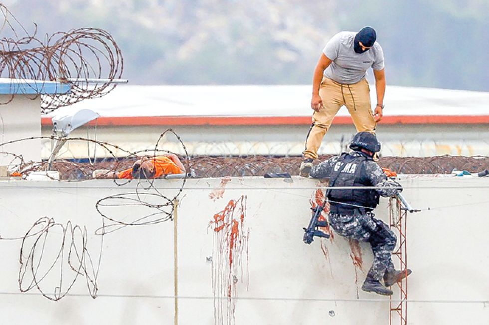 MATANZA. Un policía ecuatoriano intenta llegar a una terraza ante la mirada de un recluso. Foto: AFP Un nuevo baño de sangre con cuerpos incinerados hundió en el caos a la principal penitenciaría del puerto ecuatoriano en Guayaquil: 68 reclusos murieron en la peor matanza desde la que protagonizaron en septiembre bandas del narco con más de 100 fallecidos.