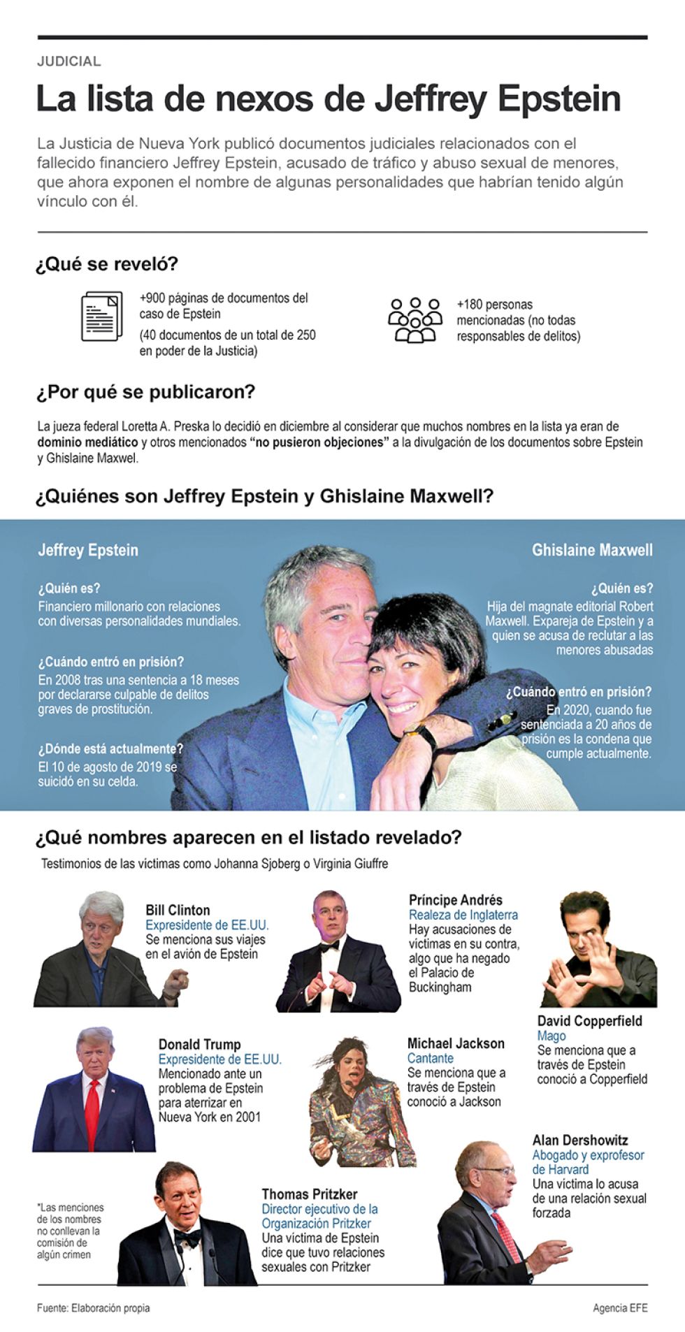 Hay casi 1.000 páginas de archivos que salieron a la luz pública y en los que se menciona a personalidades de diferentes ámbitos, algunas muy poderosas; por ejemplo, al músico, también fallecido, Michael Jackson y al mago David Copperfield.