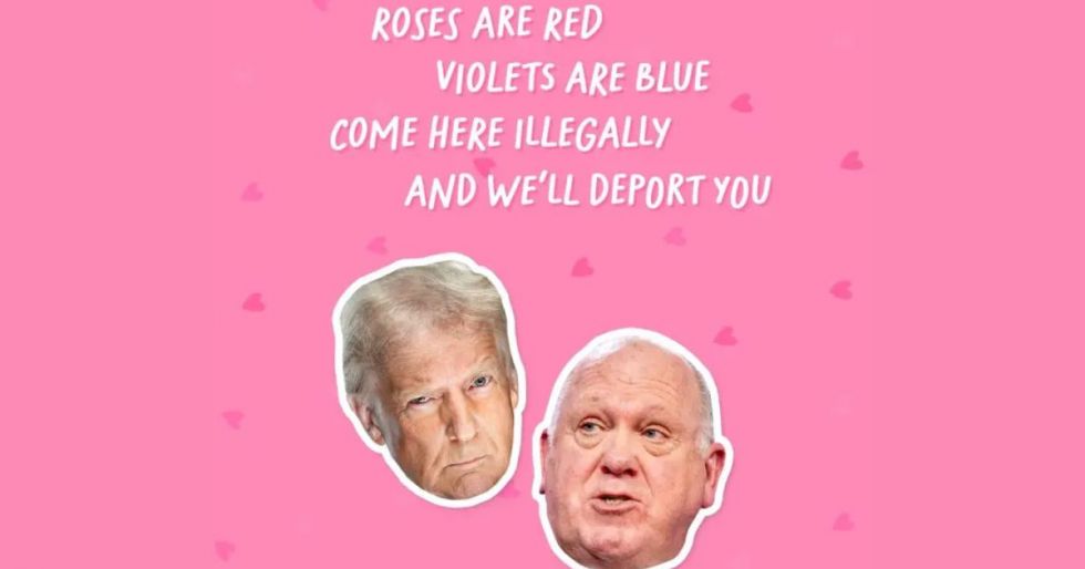 La imagen, con un fondo rosa con pequeños corazones del mismo color en tono más oscuro, incluye la cara de Trump y la de su 'zar' de la frontera, Tom Homan.