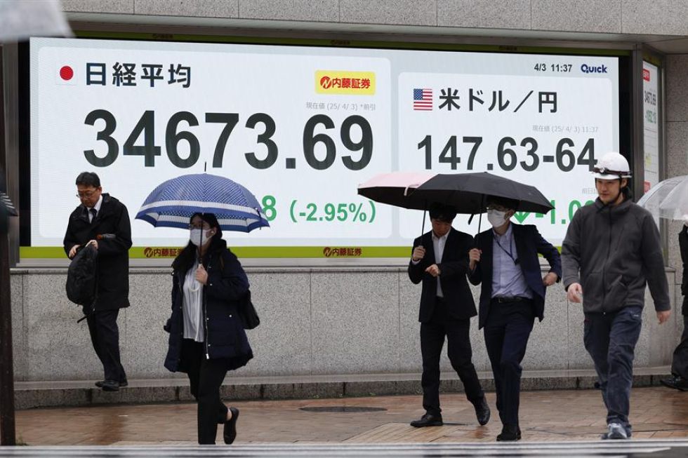 Peatones pasan junto a un panel electrónico de la bolsa que muestra el índice Nikkei de Japón. Foto: EFE El comienzo de la guerra arancelaria iniciada por el presidente de EEUU, Donald Trump, llevó a las bolsas europeas a abrir con caídas en torno al 2%, siguiendo la estela de las bolsas asiáticas que cerraron con fuertes descensos.