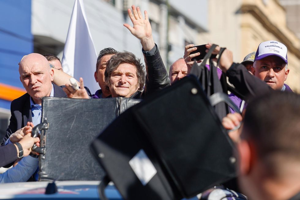 El presidente de Argentina, Javier Milei, saluda durante un acto de campaña electoral este miércoles, en Lomas de Zamora (Argentina). Foto: EFE/ Juan Ignacio Roncoroni El presidente de Argentina, Javier Milei, fue evacuado este miércoles durante un acto electoral en la provincia de Buenos Aires por incidentes con manifestantes opositores que arrojaron objetos contra la camioneta descubierta en la que viajaba, una situación que derivó en enfrentamientos entre algunos de los concentrados y efectivos policiales.