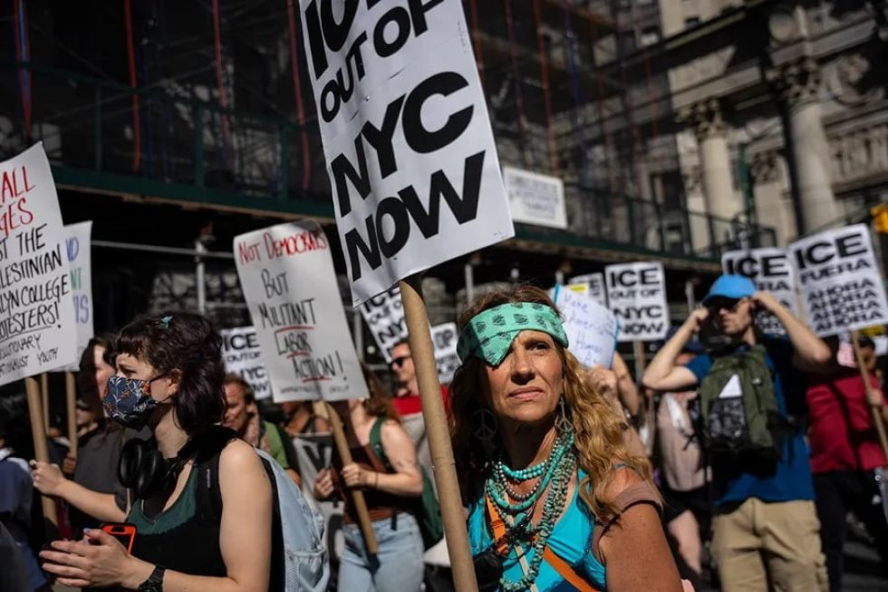 Un grupo de manifestantes protestan en Nueva York, EE.UU., contra las políticas migratorias de Donald Trump y los agentes del ICE. Foto: EFE/ Angelina Katsanis Cuatro de cada cinco latinos en Estados Unidos (80 %) afirman que las políticas del presidente Donald Trump perjudican a los hispanos, y el 71 % considera que se ha excedido en las deportaciones, según una encuesta del Pew Research Center divulgada este lunes.