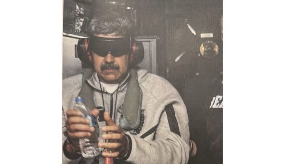 "Nicolás Maduro a bordo del USS Iwo Jima", escribió Trump en su red Truth Social junto a la imagen, en la que que Maduro aparece de pie, vestido con un chándal gris de la marca deportiva Nike, una especie de antifaz sobre los ojos y canceladores de sonido sobre los oídos, mientras sostiene una botella de agua con sus manos esposadas.