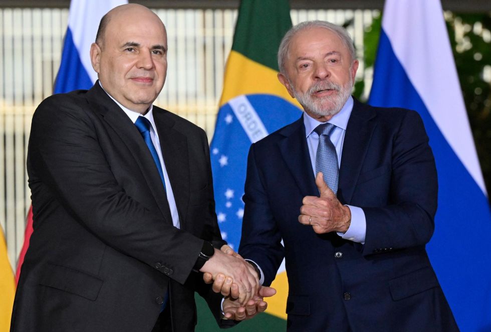 El primer ministro ruso, Mijaíl Mishustin (izq.), y el presidente brasileño, Luiz Inácio 'Lula' da Silva, se estrechan la mano durante su encuentro en el Palacio de Itamaraty. Foto: EFE/EPA/ALEXANDER MIRIDONOV / El presidente de Brasil, Luiz Inácio Lula da Silva, urgió este jueves a adoptar acciones para fortalecer el multilateralismo durante una reunión en Brasilia con el primer ministro de Rusia, Mijaíl Mishustin, en el marco de su visita al país.