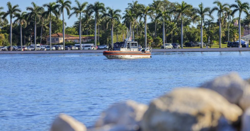 Un barco de seguridad patrulla las aguas cercanas al Club Mar-A-Lago del presidente Trump en Palm Beach, Florida. El Servicio Secreto de EEUU abatió esta madrugada a un hombre armado que entró de manera “ilegal” al perímetro de seguridad de la residencia del presidente Donald Trump en Florida.