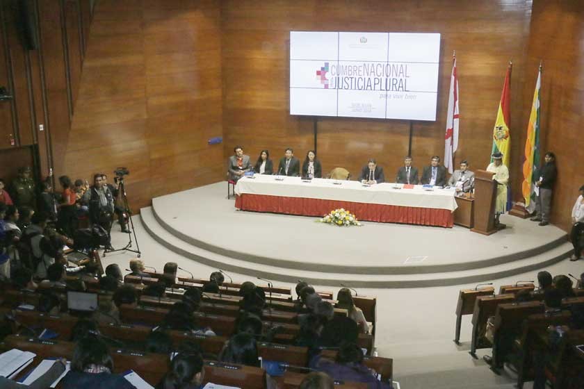 El Órgano Judicial, no obstante, también organizó su precumbre sectorial para intentar incluir en el debate la independencia, el presupuesto y el pluralismo jurídico que al final de la primera precumbre departamental en Sucre sólo quedó como transversal de los seis ejes temáticos trazados por el Gobierno: el acceso a la justicia, la corrupción, la retardación, la política criminal, la formación de los abogados en el país y el tema de la elección de las altas autoridades judiciales.
