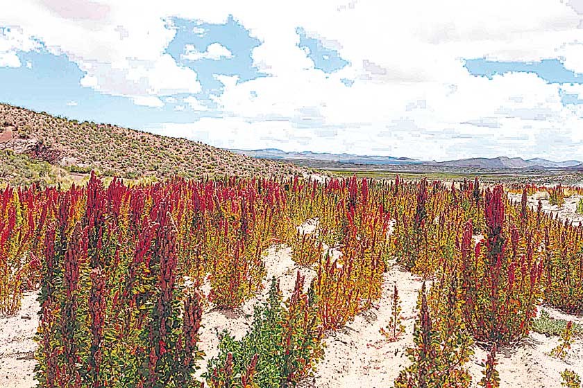 producción. Imagen de una plantación de quinua en el altiplano boliviano. La quinua tiene un alto valor nutricional “Lo mismo hemos sembrado pero la sequía y el sol nos ha afectado, cuando llueve a su tiempo hay buena producción. Nos han dicho que va a aumentar el precio, hasta ahora no ha aumentado. Tenemos guardado. Hemos conformado grupos para hacer galletas, salteña y queques”. La situación de Francisco Arcani es la de muchos agricultores del altiplano que depositaron sus ilusiones en el mercado del grano de oro y ahora se sienten frustrados, pues la demanda del producto ha caído.