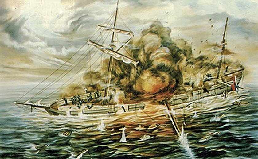 GUERRA. La goleta Covadonga de la Armada chilena acabó hundida por un hábil ataque de Perú, en Chanchay, el 13 de septie Al inicio de la Guerra del Pacífico, Perú cuenta con un arma naval de invención reciente, en la que se cifran grandes esperanzas: el torpedo. En previsión del inminente conflicto, Perú adquiere diez torpedos Lay, de fabricación norteamericana. Teniendo listos dos de ellos en Iquique, el 22 de agosto de 1879, el blindado peruano Huáscar –comandado por Miguel Grau– recibe la orden de dirigirse a Antofagasta para emplearlos contra el blindado chileno Blanco Encalada –aprovechando que éste está recibiendo mantenimiento– y así obtener una ventaja sobre la escuadra enemiga. Esa noche el Huáscar y el transporte Oroya recogen los torpedos en Iquique y zarpan rumbo a la costa boliviana.