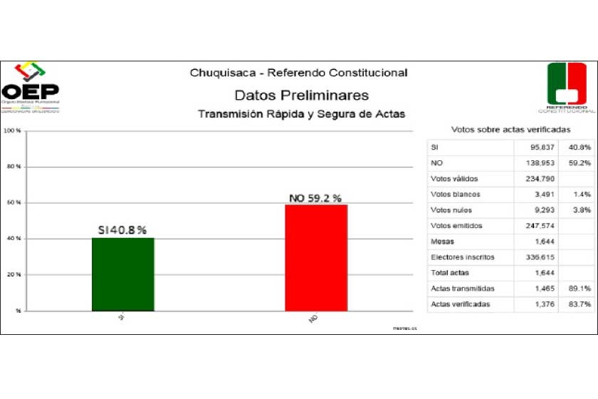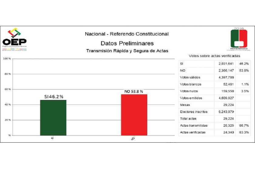De acuerdo con el cómputo de “Transmisión Rápida y Segura de Actas”, el No vence con 53.8% al Sí, que tiene 46.2%, lo que deja una diferencia de 7.6% entre el primero y el segundo. Todavía resta por escrutarse un 13.8% de las actas que provienen mayoritariamente del área rural y las del voto en el exterior.