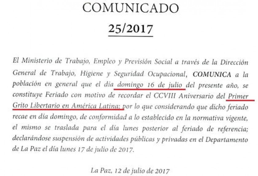 Un comunicado del Ministerio de Trabajo, en que se afirma que el 16 de julio se conmemora el Primero Grito de Libertad en Latinoamérica, provocó este viernes diversos reacciones de protesta entre los capitalinos.