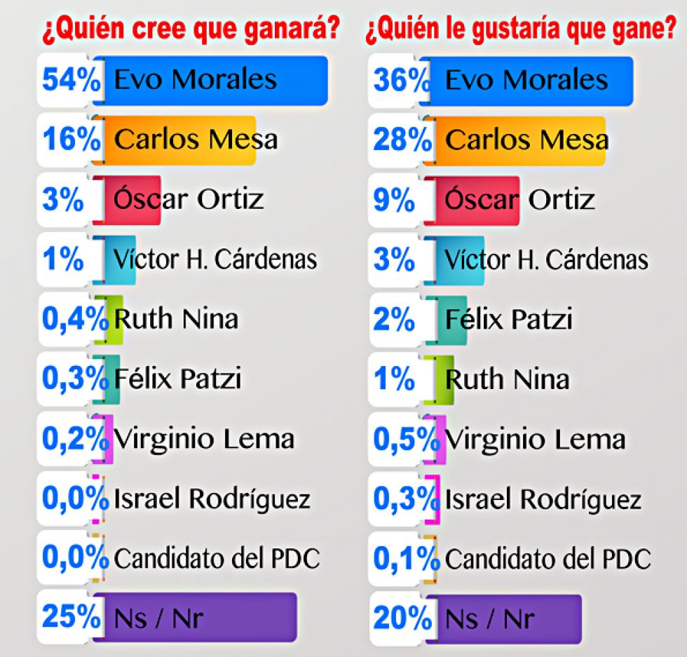 El 54% de los entrevistados a nivel nacional cree que ganará Evo Morales, el 16% Carlos Mesa, el 3% Óscar Ortiz, el 1% Víctor Hugo Cárdenas y menos del 1% se reparten entre Ruth Nina, Félix Patzi, Virginio Lema y el candidato del PDC. En este caso, No sabe/No responde tienen un alto porcentaje: 25%.