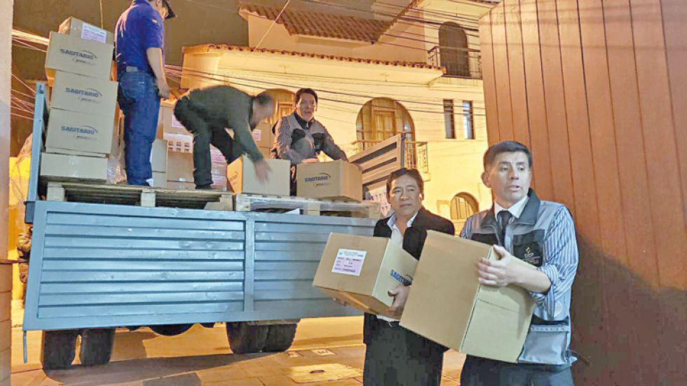 Dos días antes de lo previsto, las papeletas electorales para Chuquisaca llegaron ayer de La Paz en un camión. Las cajas fueron descargadas por el personal del TED y resguardadas en un almacén.