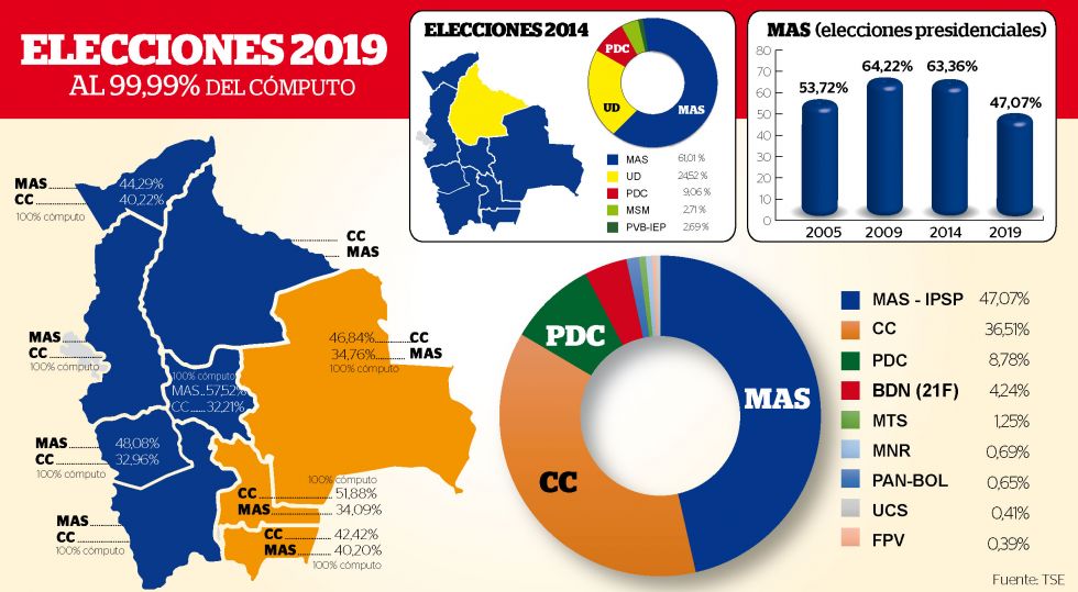 El líder del Movimiento Al Socialismo (MAS) logra esta vez el 47,07%, de votos suficiente para imponerse al opositor Carlos Mesa (Comunidad Ciudadana), que queda en el 36,51%, en espera de la proclamación definitiva de resultados por el Órgano Electoral.