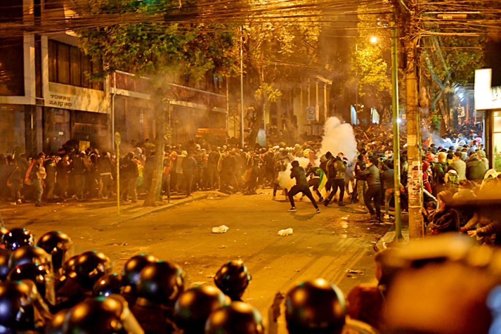 LA PAZ. Una marcha de estudiantes y ciudadanos cerró anoche con una gasificación por parte de los policías cuando los movilizados intentaron llegar al Tribunal Supremo Electoral. Foto: Marka Registrada