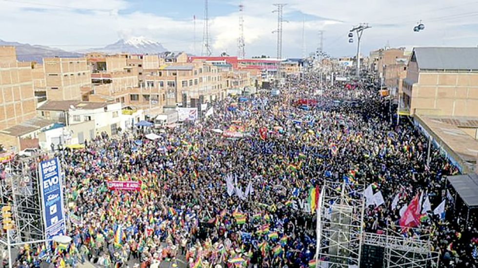Mientras eso sucedía, en El Alto, otra multitud se concentró para apoyar al binomio oficialista. Los ponchos rojos avanzaron por las calles hasta llegar hasta la estación del teleférico rojo donde brindaron pleno respaldo a Morales y pidieron que se respeten los resultados proclamados por el Tribunal Supremo Electoral. Rechazaron las acusaciones de fraude y festejaron la victoria. El dirigente de la Federación de Cooperativas Mineras de La Paz (Fedecomin), Simón Condori, amenazó con desbloquear por la fuerza; mientras que el dirigente de la COB, Juan Carlos Huarachi advirtió con un cerco a La Paz.