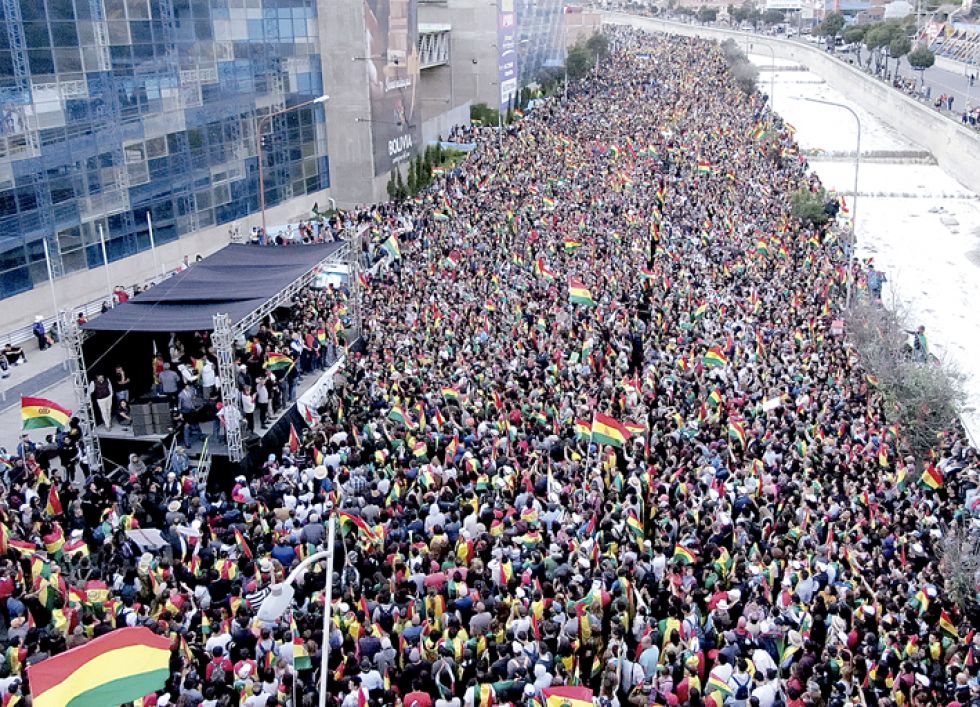 El cabildo por la democracia, a convocatoria de la Coordinadora de Defensa de la Democracia, se concentró en el campo ferial de Següencoma, con una masiva presencia de ciudadanos. “El único objetivo es defender el voto. Mesa será presidente”, gritó el jefe de Unidad Nacional (UN), Samuel Doria Medina. “Esta es una lucha pacífica y mañana será igual”, añadió el alcalde paceño Luis Revilla. Cuando le tocó el turno a Carlos Mesa una gran ovación se escuchó en el lugar. “A la cárcel o a la Presidencia”, arengó y demandó no aflojar las movilizaciones.