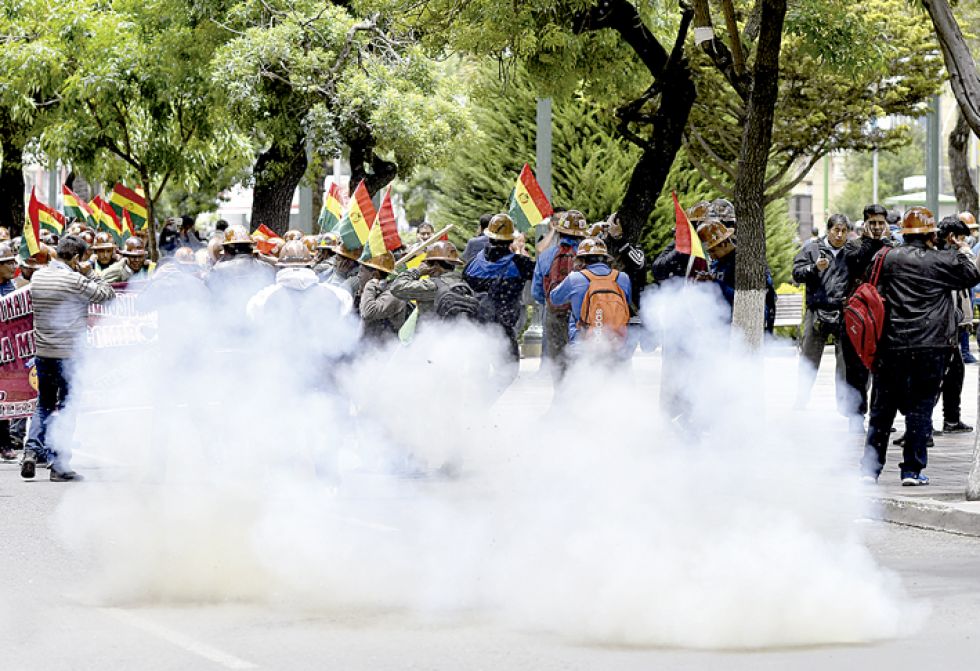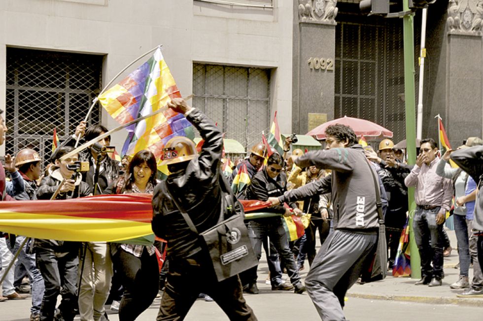 En la urbe paceña, tres maestros resultaron afectados tras ser agredidos por mineros afines al MAS que llegaron a la sede de Gobierno y que con el uso de dinamistas, marcharon por el centro causando zozobra en la población.