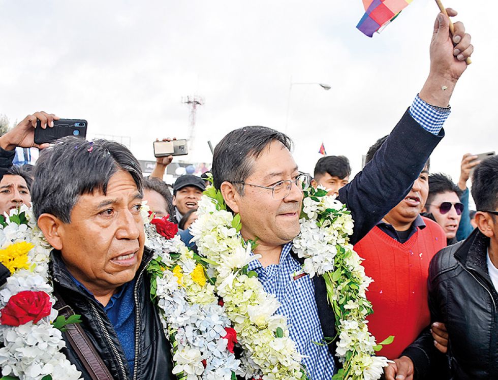 Ajeno a la orden de una fiscal de La Paz, en el exterior del aeropuerto le esperaba un numeroso y colorido grupo de seguidores del MAS, que le paseó a hombros al grito de "Lucho, Lucho, Lucho".