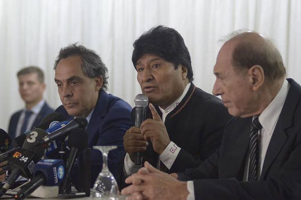 Expresidente Evo Morales junto a sus abogados Zaffaroni y Ferreyra. Expresidente Evo Morales junto a sus abogados Zaffaroni y Ferreyra. Foto: Pedro Perez / Erbol