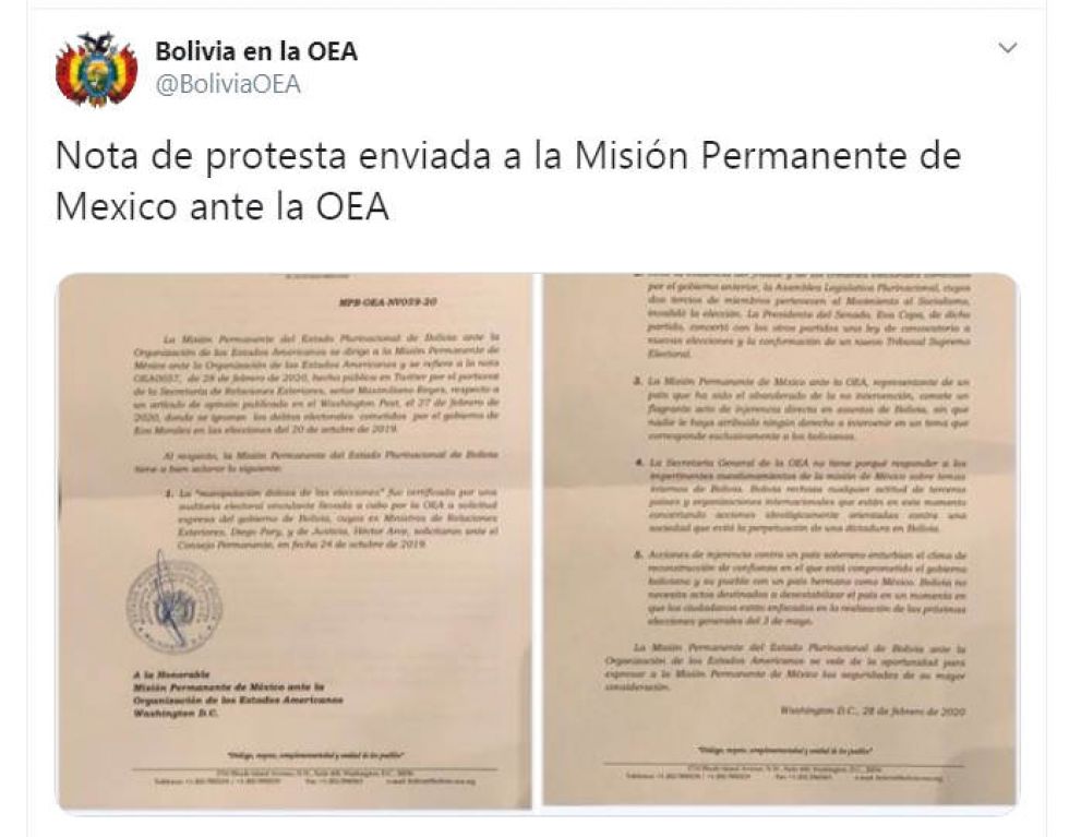 Esta es la nota enviata por la Misión Permanente de Bolivia y que fue replicada en su cuenta oficial de Twitter. Foto: Captura La Misión Permanente del Estado boliviano ante la Organización de los Estados Americanos (OEA) envió una carta de protesta a la Misión Permanente de México y se refiere a la nota OEA0057, de 28 de febrero de 2020, que dio a conocer el secretario de Relaciones Exteriores, Maximiliano Reyes, respecto a un artículo de opinión publicado en el Washington Post, donde "se ignoran los delitos electorales" cometidos, según, por el Gobierno de Evo Morales en las anteriores elecciones.