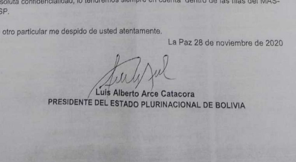 El ministro de Justicia y Transparencia Institucional, Iván Lima, denunció este lunes que, la firma del presidente Luis Arce fue falsificada. Mediante una carta en una hoja membretada, se pretendía adquirir un préstamo del Banco Unión, de una suma de 250 mil dólares.