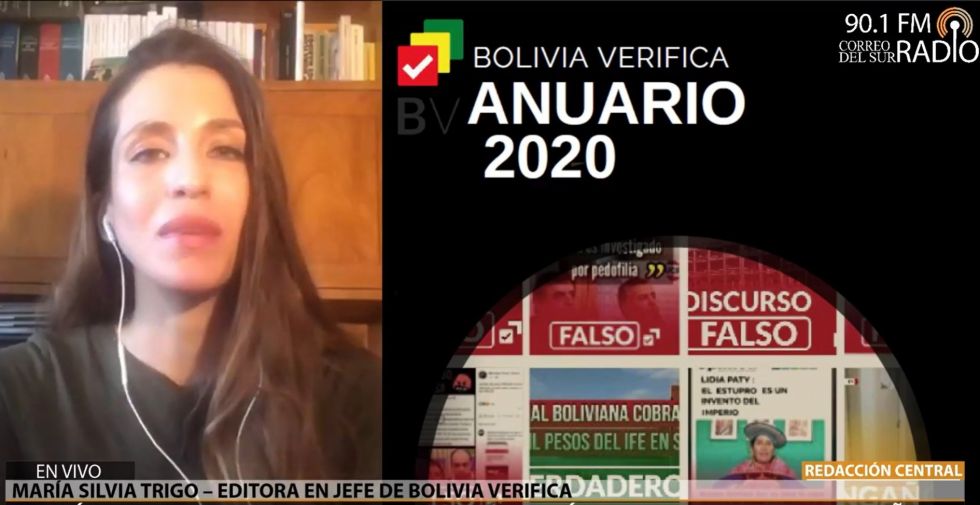 Contiene dos grandes temas: la pandemia de coronavirus y las elecciones en Bolivia; es decir, cuánto de verdad y cuánto de mentira se dijo respecto a estas cuestiones en este 2020. “La mayoría referidas al tema de coronavirus y en menor medida a temas políticas”, precisa la editora de esta publicación, María Silvia Trigo, entrevistada por Correo del Sur Radio FM 90.1 (ver abajo).