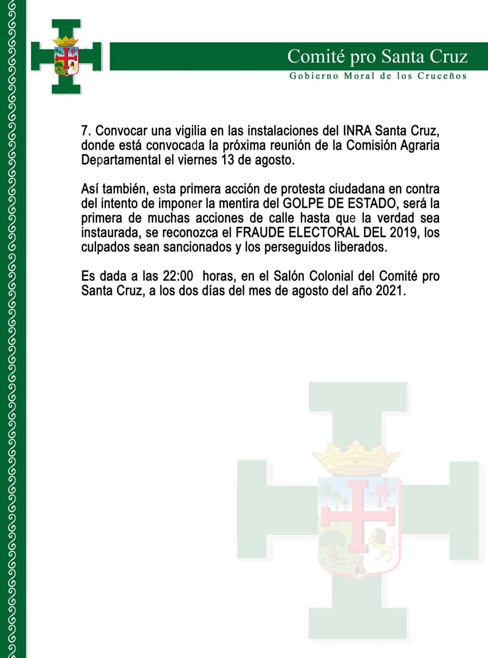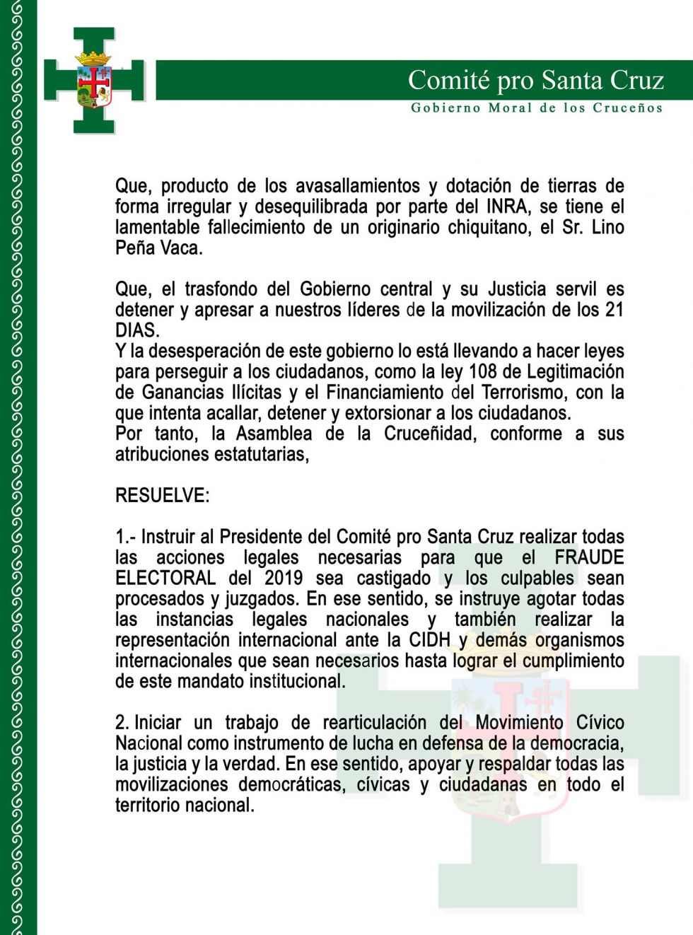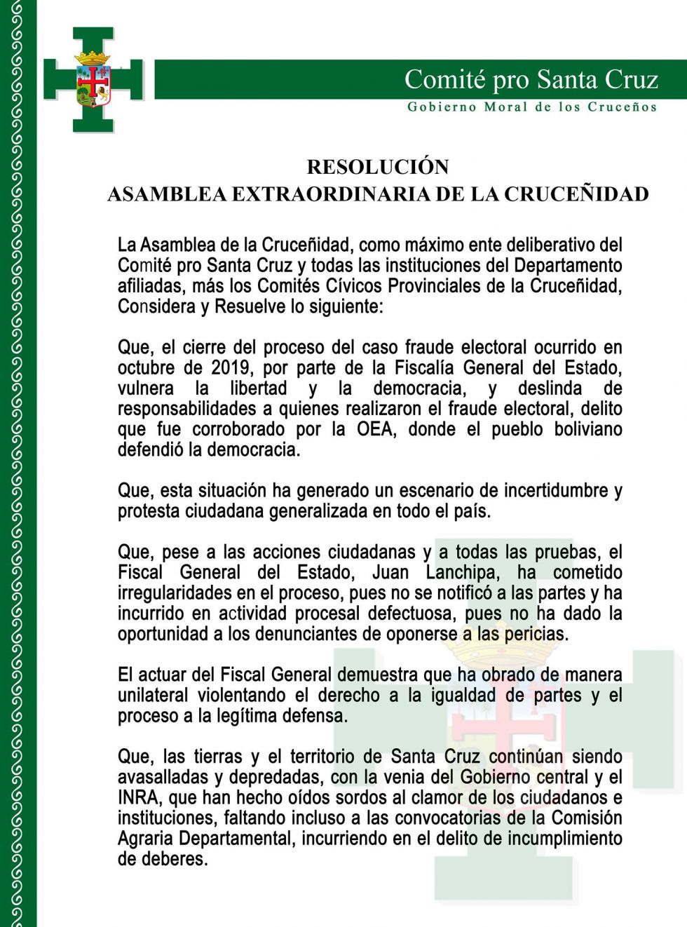- Instruir al presidente del Comité pro Santa Cruz realizar todas las acciones legales necesarias para que el caso fraude electoral del 2019 sea sancionado y que los culpables sean procesados y juzgados. En ese sentido, se instruye agotar todas las instancias legales nacionales y también realizar la representación internacional ante la CIDH y demás organismos internacionales que sean necesarios hasta lograr el cumplimiento de este mandato institucional.