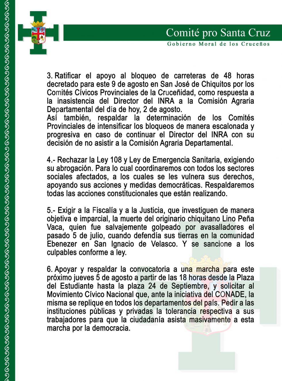 - Ratificar el apoyo al bloqueo de carreteras de 48 horas decretado para este 9 de agosto en San José de Chiquitos por los comités cívicos provinciales de la cruceñidad, como respuesta a la inasistencia del Director del INRA a la Comisión Agraria Departamental del día de hoy, 2 de agosto. Así también, respaldar la determinación de los comités provinciales de intensificar los bloqueos de manera escalonada y progresiva en caso de continuar el director del INRA con su decisión de no asistir a la Comisión Agraria Departamental.