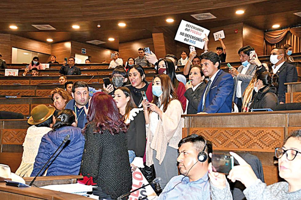 Oficialistas y opositores no pararon de gritar, silbar y golpear sus curules. La oposición, con pancartas y mensajes de “Defensoría del Pueblo, no defensoría del MAS”, rodeó al vicepresidente David Choquehuanca para evitar que continúe la sesión, pero esto no ocurrió.