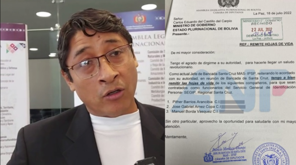 “Como actual Jefe de Bancada Santa Cruz MAS-IPSP, reiterando lo acordado con su autoridad, en reunión de Bancada de Santa Cruz, tengo a bien remitir las hojas de vida de los siguientes compañeros, para que sean contratados como funcionarios del Servicio General de Identificación Persona-SEGIP, Regional Santa Cruz”, dice la carta del diputado Mendoza.