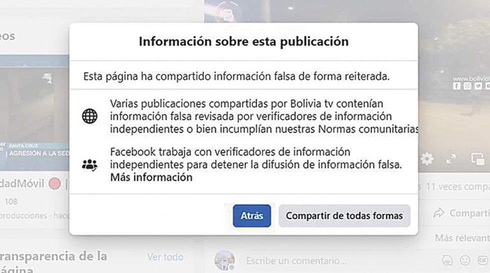 Facebook explicó que la alerta se debió a que “algunas publicaciones compartidas por Bolivia tv contenían información falsa revisada por verificadores de datos independientes o que infringía nuestras normas comunitarias”.