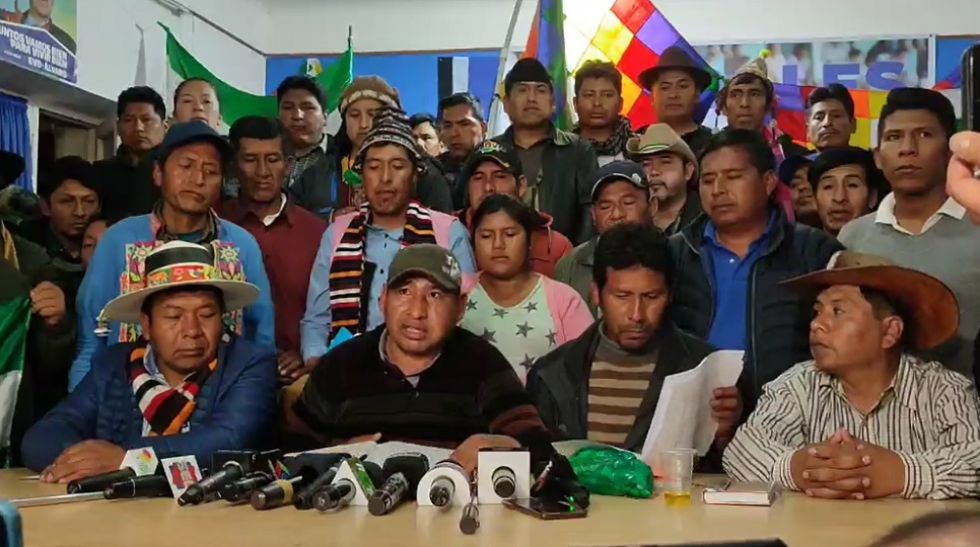 “Por lo tanto, el Pacto de Unidad junto con la Dirección Nacional (MAS) están convocando a un ampliado nacional en Cochabamba donde se va a planificar y decidir qué es lo que va a pasar con el Gobierno central y con el TSE”, anunció.