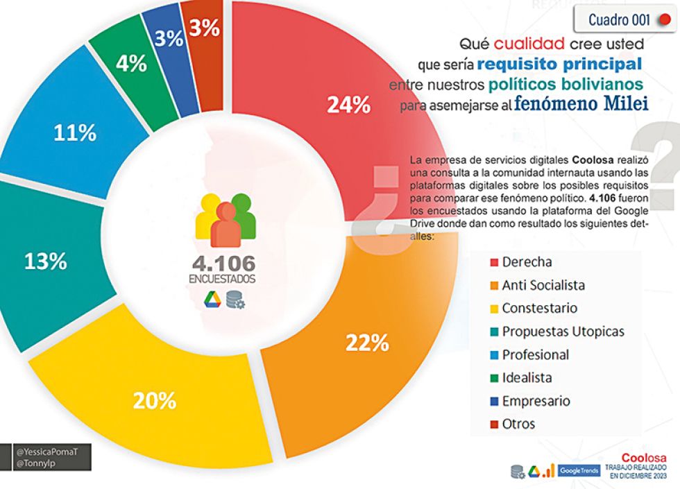 La nómina identifica a personas con un supuesto perfil para ser la versión boliviana del nuevo presidente de Argentina, el libertario Javier Milei, y se ha levantado sobre la base de los resultados de una encuesta digital que realizó Coolosa de Comunicaciones, que se dedica a la capacitación y asesoramiento en redes sociales para empresas. La encuesta utilizó la plataforma Google Drive y fue aplicada a un total de 4.106 internautas; es decir, personas que navegan o usan con alguna frecuencia las redes digitales.