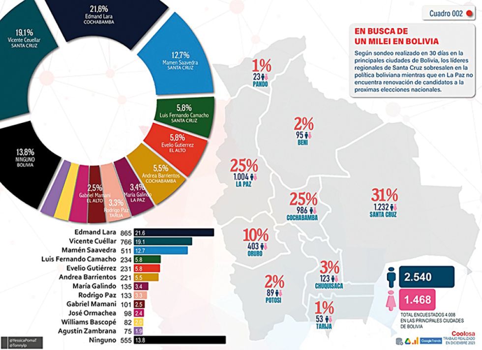 La encuesta de Coolosa de Comunicaciones identifica a 12 personas y las que ocupan los cuatro primeros lugares son de o viven en Santa Cruz de la Sierra. El excapitán de la Policía Edmond Lara es cochabambino, pero vive en esa ciudad del oriente boliviano.