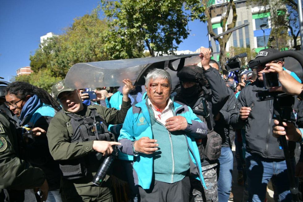 El alcalde de La Paz, Iván Arias, resultó herido la mañana de este miércoles en la plaza Abaroa, adonde fue para evitar destrozos, pero terminó con el rostro ensangrentado a causa de una pedrada.