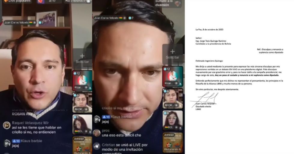 El diputado electo por la Alianza Libre, Juan Carlos Velarde, anunció su renuncia al cargo tras la controversia generada por una expresión considerada racista durante un debate transmitido en vivo por una plataforma digital.
