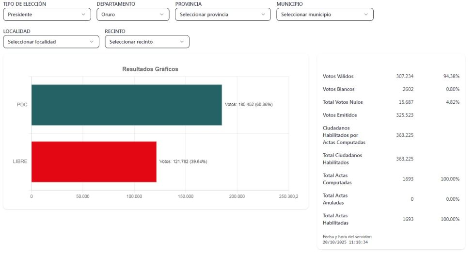 El cómputo oficial del departamento de Oruro llegó al 100%. El Partido Demócrata Cristiano (PDC), de Rodrigo Paz, consiguió el primer lugar, con el 60,36% de los votos, sobre la Alianza Libre de Tuto Quiroga (39,64%).