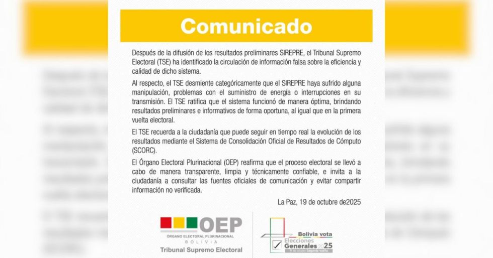 El Órgano Electoral Plurinacional (OEP) explicó que el Sirepre operó con normalidad, proporcionando resultados preliminares oportunos, al igual que ocurrió en la primera vuelta electoral.