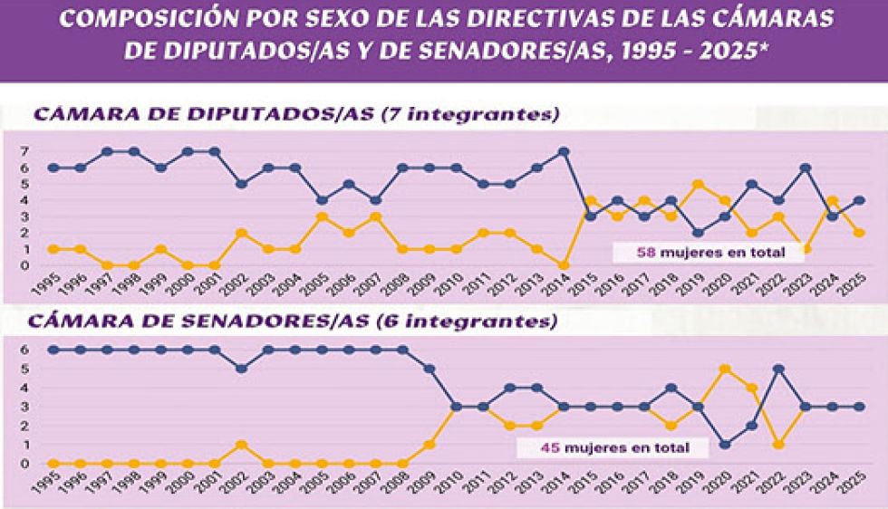 Entre 1995 y 2025, la participación de las mujeres en las directivas del Órgano Legislativo ha sido progresiva, pero minoritaria.