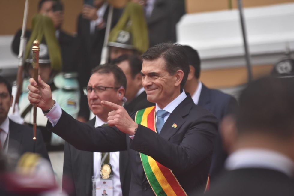 A su paso, acompañado de su esposa, María Elena Urquidi, y del vicepresidente Edmand Lara, recibió muestras de apoyo y aprecio de las personas que se apostaron desde muy temprano en los alrededores del centro del poder político.