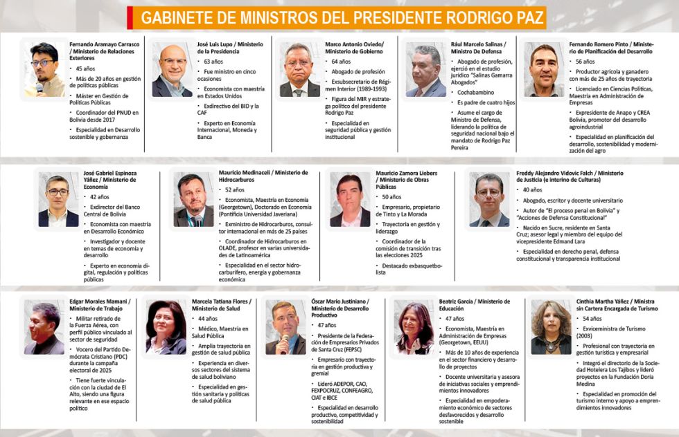 La composición del gabinete, por otro lado, muestra que Paz, básicamente, distribuyó el poder entre sus aliados políticos. Como ejemplos, la alianza Unidad, de su principal socio Samuel Doria Medina, está representada por los ministros Lupo y Espinoza. También tienen presencia el entorno de su vicepresidente, Edmand Lara, con el ministro Vidovic, su abogado personal; el Partido Demócrata Cristiano (PDC), sigla que usó en las elecciones, con el ministro de Trabajo, Édgar Morales, una figura reconocida de El Alto; y el sector agroempresarial de Santa Cruz, con los ministros Justiniano y Romero. Incluso se observa la presencia de figuras del extinto MIR, como el ministro de Gobierno, Marco Antonio Oviedo, quien fue subsecretario de Régimen Interior en el gobierno de Jaime Paz Zamora, padre del actual Presidente.