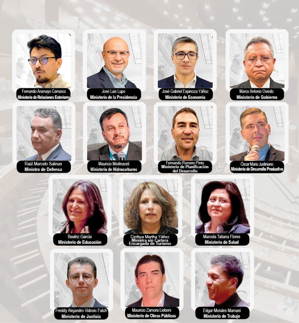 El gabinete lo completan Fernando Aramayo, en Relaciones Exteriores; Raúl Salinas, en Defensa; José Romero, en Planificación del Desarrollo; Mauricio Zamora, en Obras Públicas; Marcela Flores, en Salud y Deportes, y Beatriz García, en Educación. A ellos se suma Cinthya Yáñez Eid, en el nuevo ministerio sin cartera de Turismo y Gastronomía.