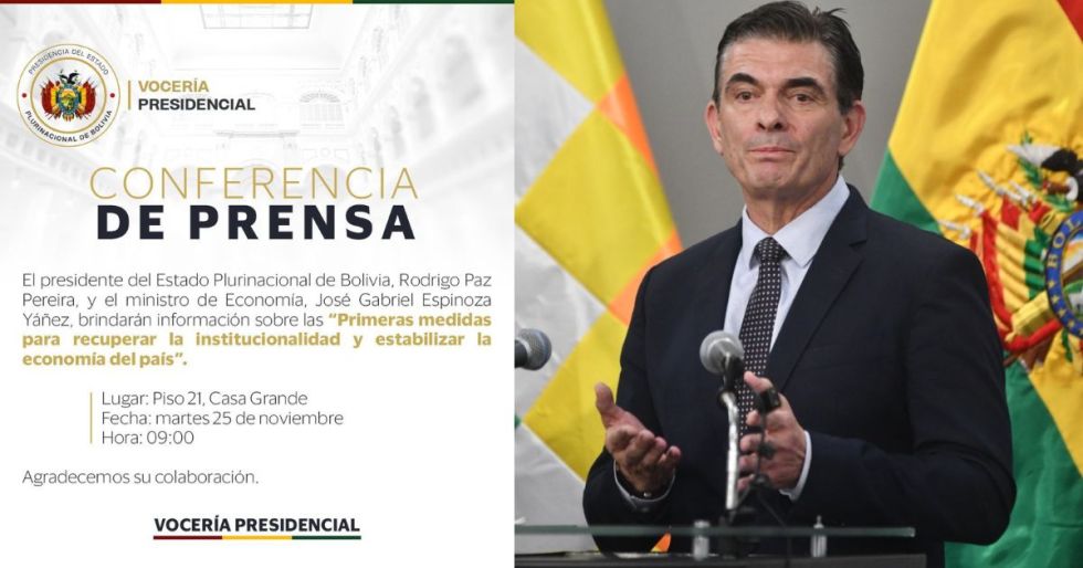 El Gobierno anunció que este martes el presidente Rodrigo Paz, acompañado por el Ministro de Economía, dará a conocer las Primeras Medidas para Recuperar la Institucionalidad y Estabilizar la Economía del País. La presentación se realizará a las 9:00 en el piso 21 de la Casa Grande del Pueblo, según informó la vocería presidencial.