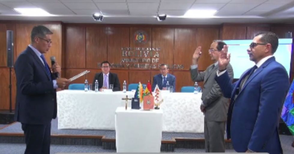 El ministro de Economía y Finanzas Públicas, José Gabriel Espinoza, posesionó este martes a dos nuevas autoridades en entidades clave del Estado. Jorge Leonardo Zogbi Nogales asumió como Presidente Ejecutivo del Servicio de Impuestos Nacionales (SIN), mientras que Alberto Samuel Soto de la Vía fue designado como Presidente Ejecutivo de la Aduana Nacional de Bolivia.